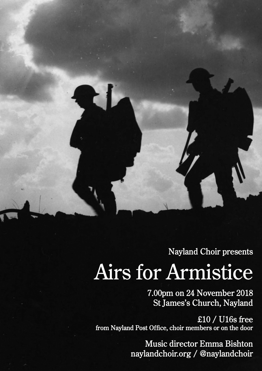 Airs for Armistice. Music from composers who served in, or were connected to, the First World War. Ralph Vaughan Williams, Edward Elgar, Charles Villiers Stanford, Gabriel Faure, Max Reger, Lorenzo Perosi, Sibelius, Gustav Holst, Fernand Halphen, George Butterworth, Ernest Farrar and Samuel Barber.