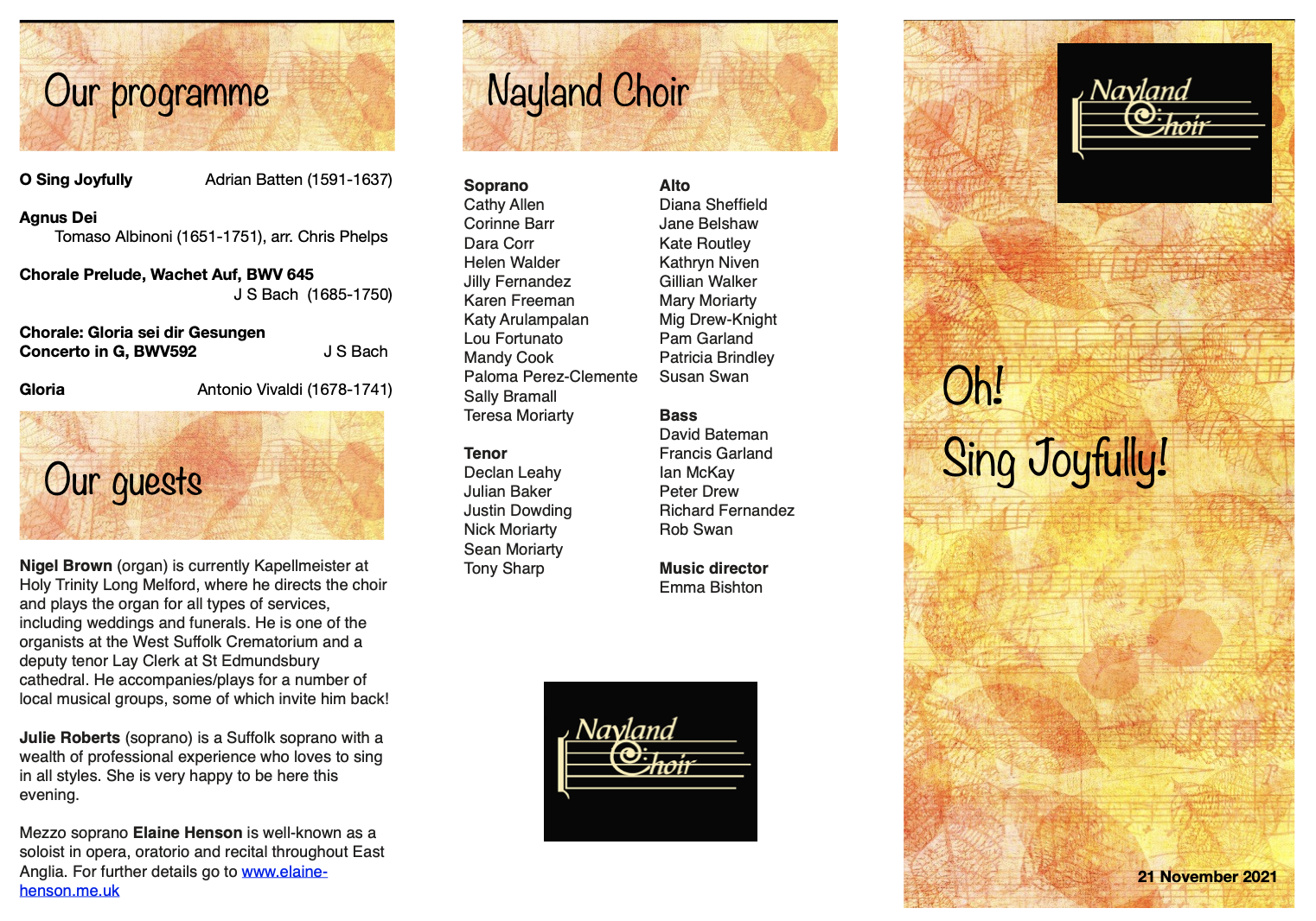 Oh what a beautiful morning (Rodgers/ Hammerstein, arr. Stickles), Where’re you walk (Handel/ Congreve), Silent worship (Handel, arr. Bishton/ Somervell), Hope is like a harebell (Somervell/ Rossetti), Twist me a crown of windflowers (Somervell/ Rossetti), As torrents in summer (Elgar/ Longfellow), I praise the tender flower (Finzi/ Bridges), Cheres fleurs (Massenet/ Legrand & von Redvitz), The lily and the rose (Chilcott), The rose (Gjeilo/ Rossetti), Willow Song (traditional, arr. Bullard), I know a bank where the wild thyme blows (Quartel/ Shakespeare), Like a singing bird (Chilcott/ Rossetti & Burns), The green Leaves of summer (Tiomkin, arr. Lee/ Webster), The last rose of summer (traditional, arr. L’Estrange/ Moore), Wild mountain thyme (traditional, arr. Bishton), Scarborough fair (traditional, arr. Bishton), Where have all the flowers gone? (Seeger, arr. Bishton), Beauty and the Beast medley (Menken, arr. Emerson/ Ashman), We’ll gather lilacs (Novello, arr. Derbyshire), What a wonderful world (Weiss & Thiele, arr. Brymer)